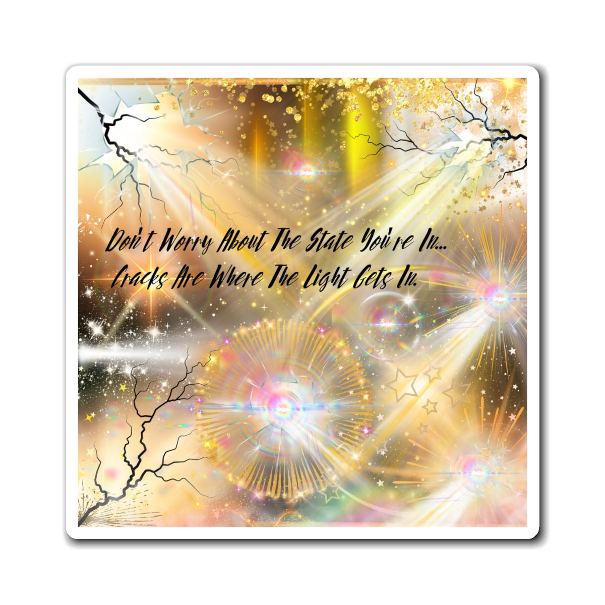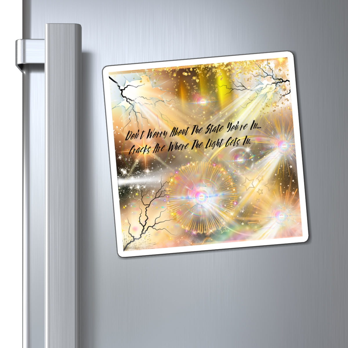 Illuminate your space with bold beauty and striking symbolism with this set of inspirational magnets. This artwork captures a mesmerizing image of cracked glass, where radiant light breaks through, turning what’s broken into something breathtaking. Each glowing crack tells a story of resilience, transformation, and the unexpected beauty that can shine through life’s shattered moments.