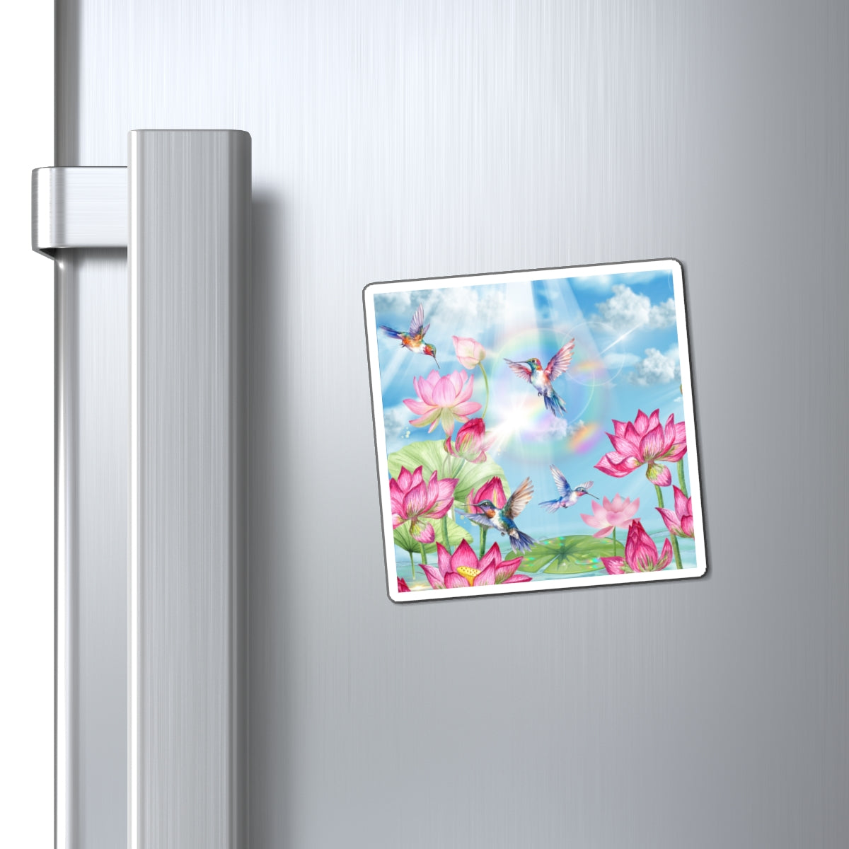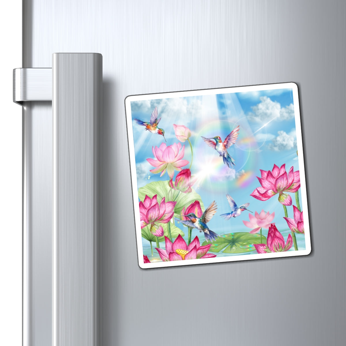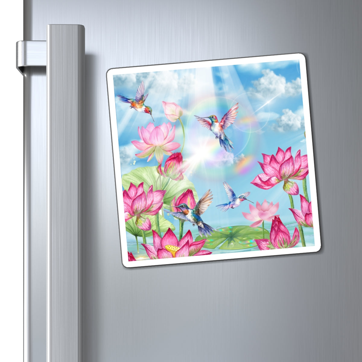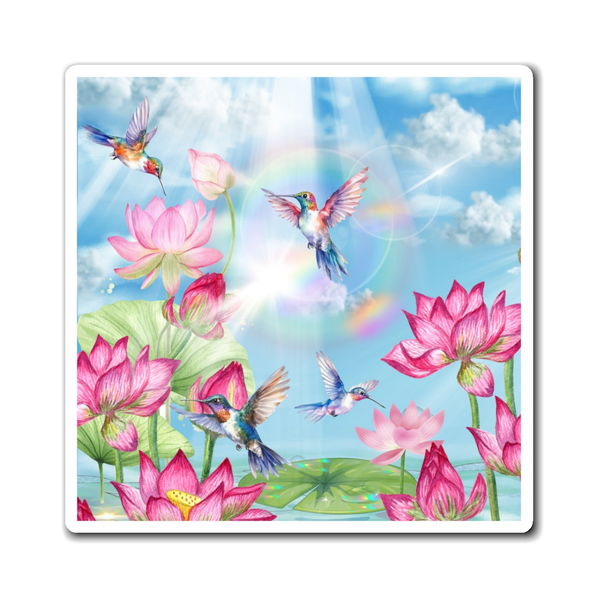 Bring a burst of radiant joy to your space with the Sipping On Sunshine Magnet, a vibrant celebration of light, nature, and serenity. Featuring brilliantly colored hummingbirds dancing among blooming lotus flowers beneath a luminous sky, this design captures the essence of peace and renewal. The rainbow hues and soft sunbeams evoke a feeling of warmth and optimism perfect for brightening up your day every time you see it.
