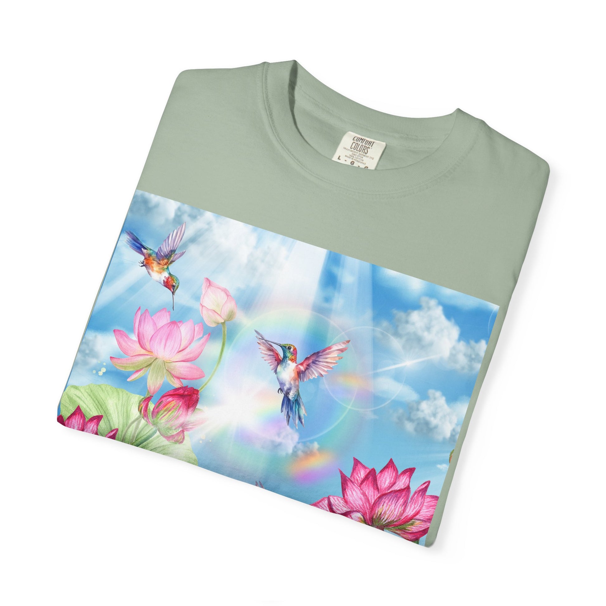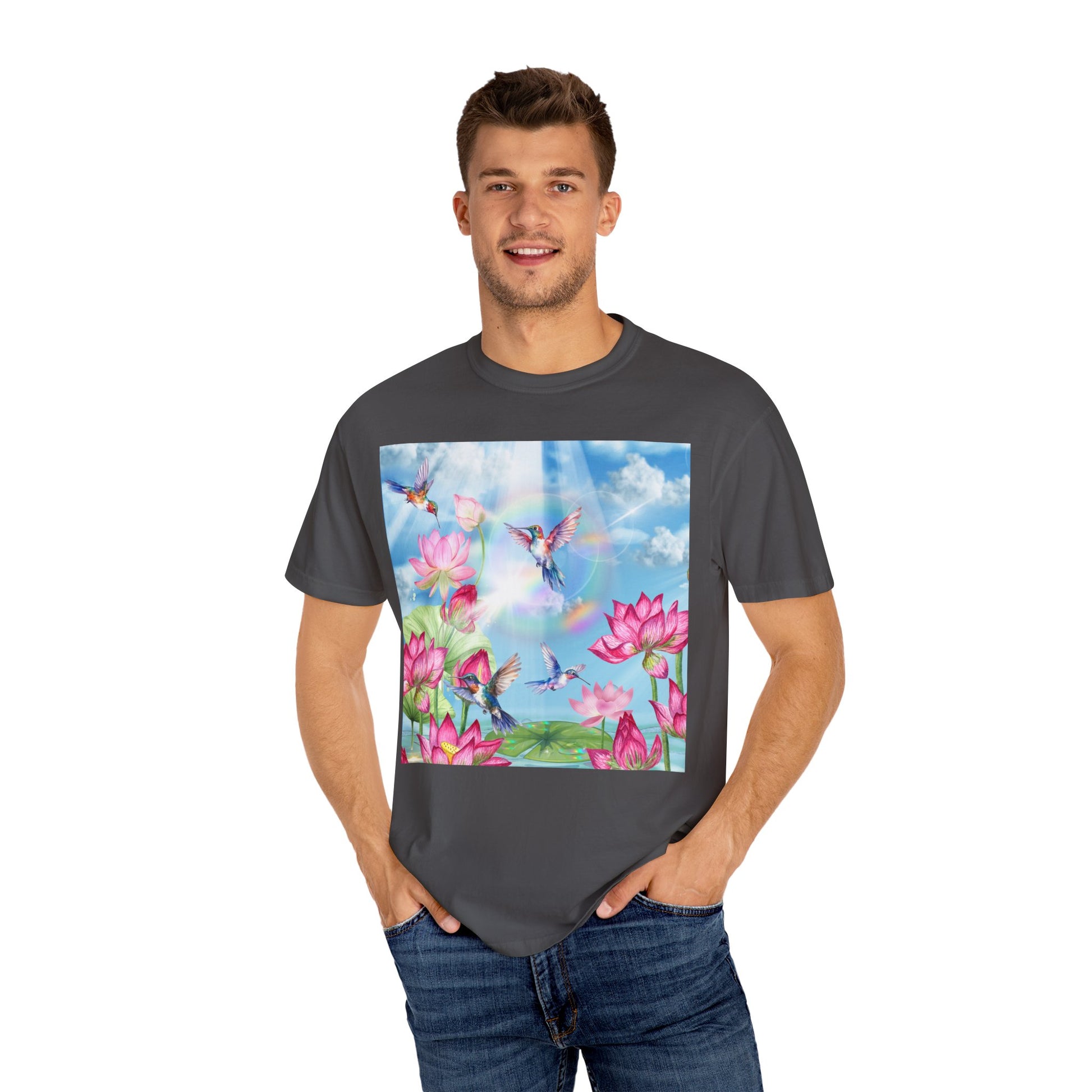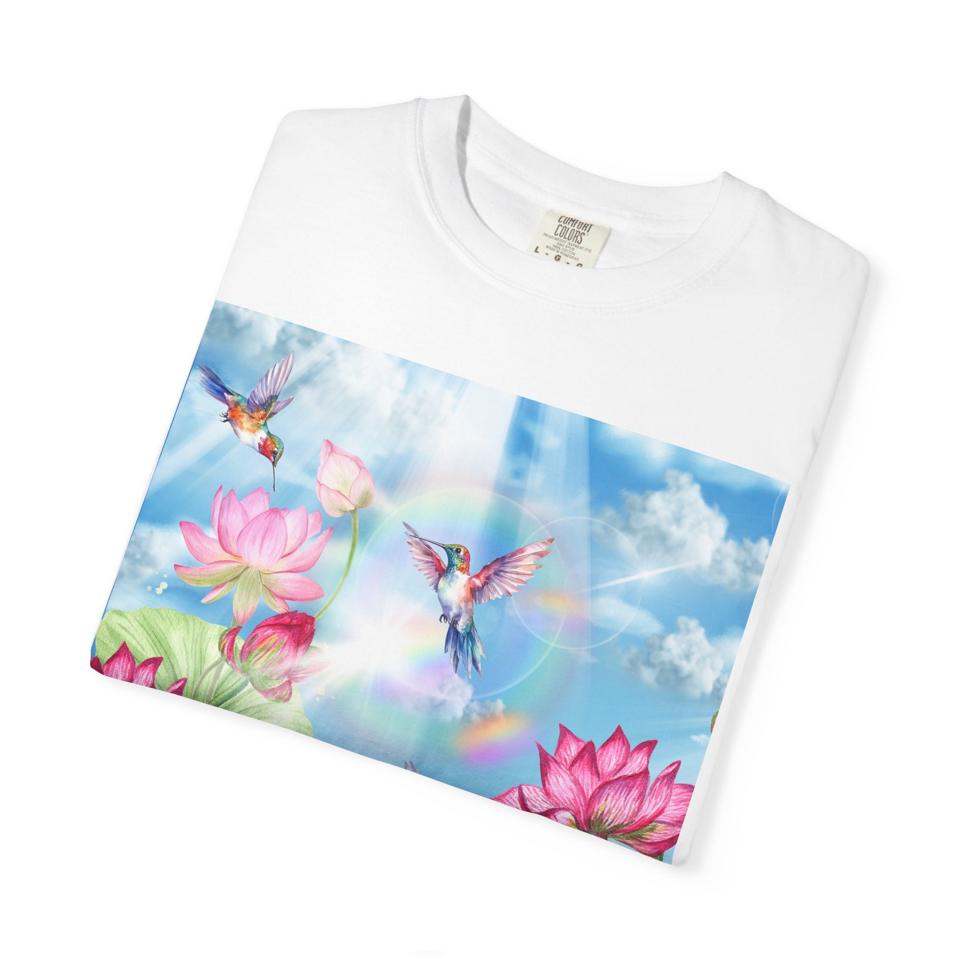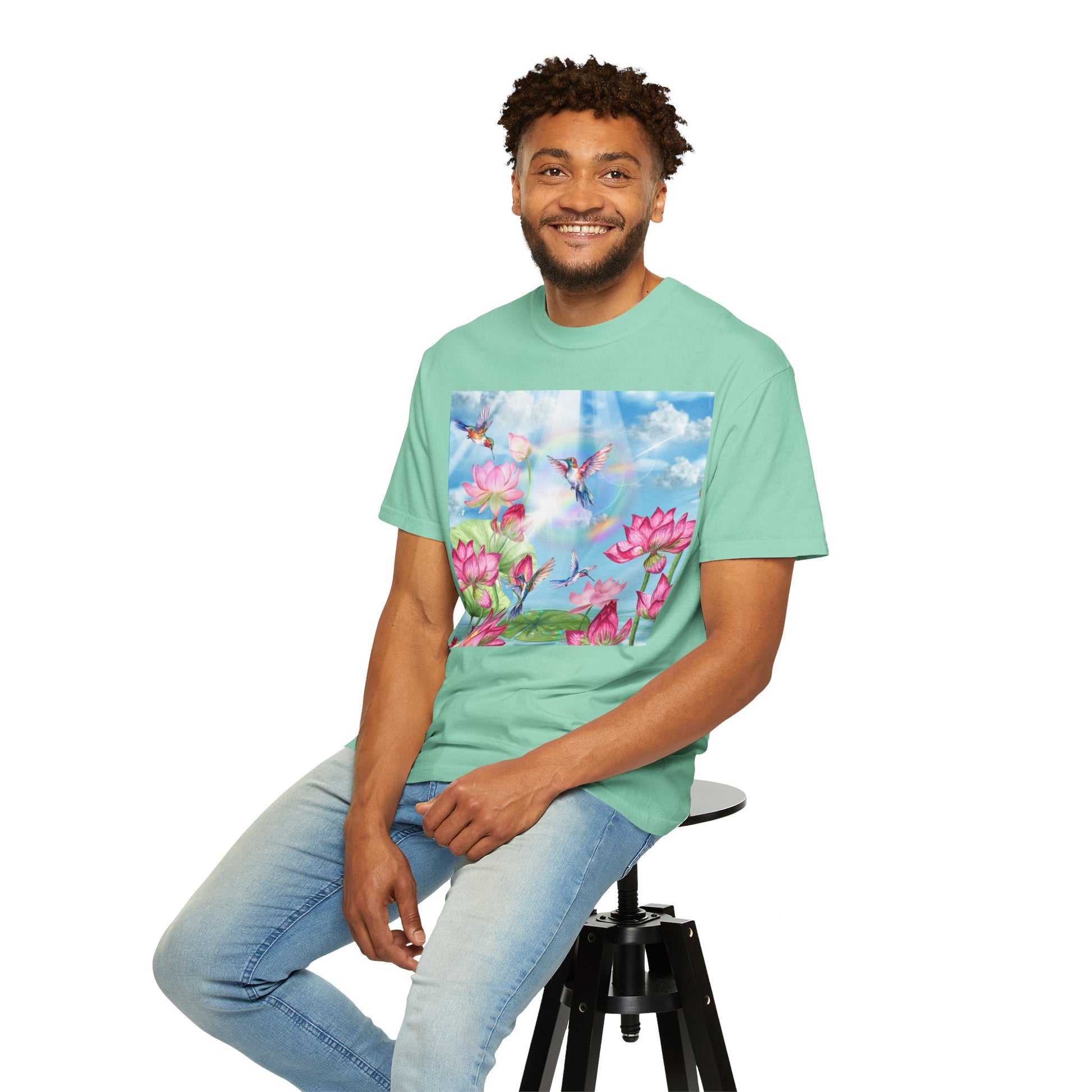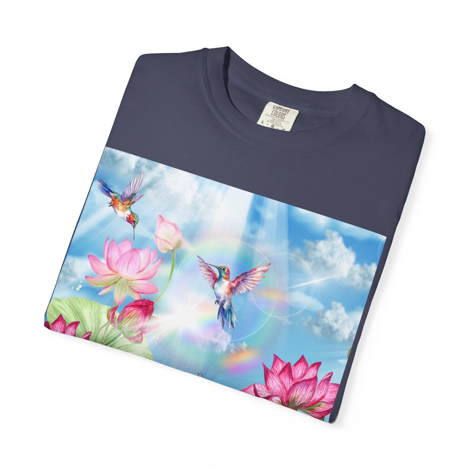A comfortable and versatile garment-dyed T-shirt featuring a design of hummingbirds sipping nectar against a blue sky. This relaxed fit tee is perfect for nature lovers and those who appreciate serene and peaceful vibes. Ideal for casual wear or as a gift for bird enthusiasts, this T-shirt is relevant for outdoor events, birdwatching outings, and nature-themed occasions.