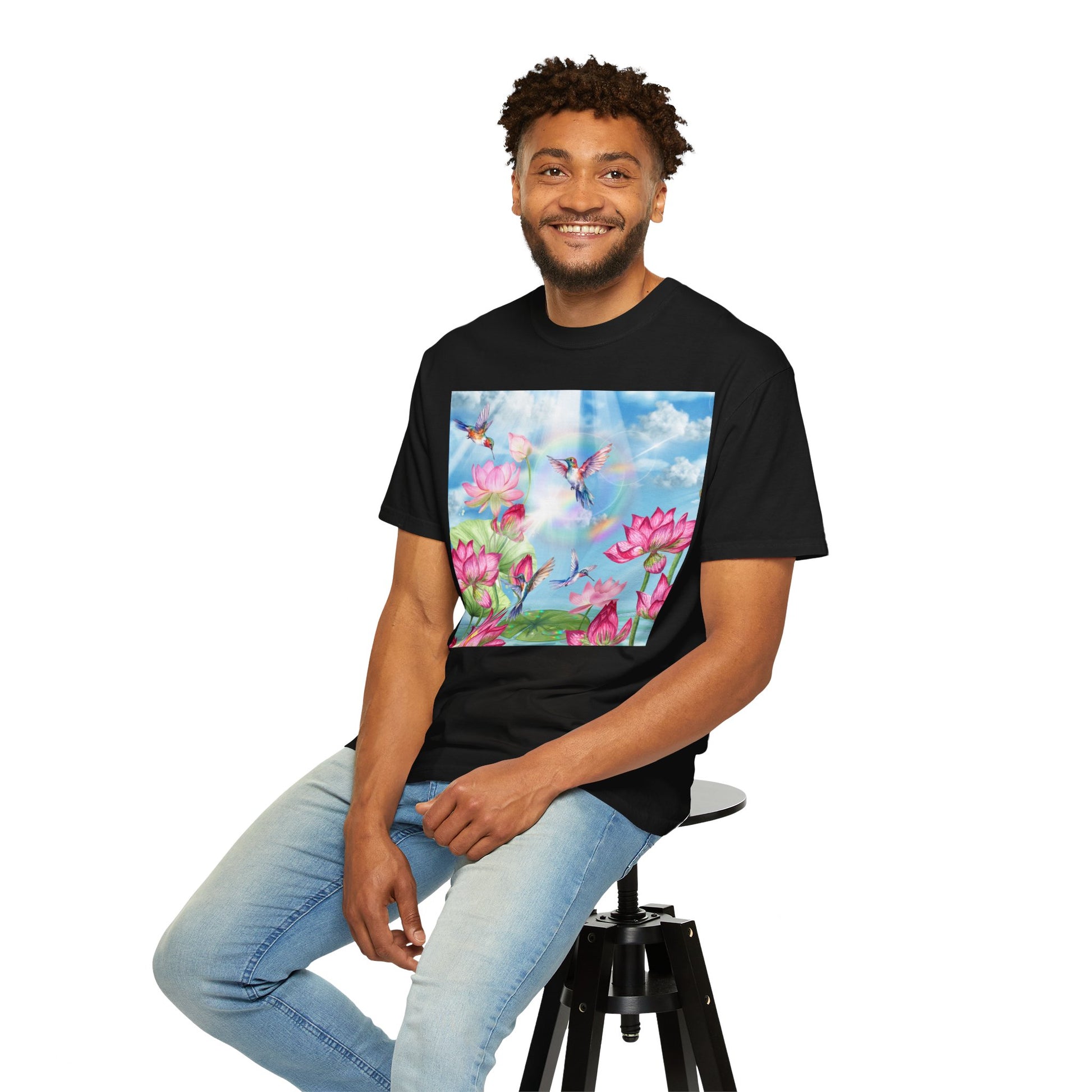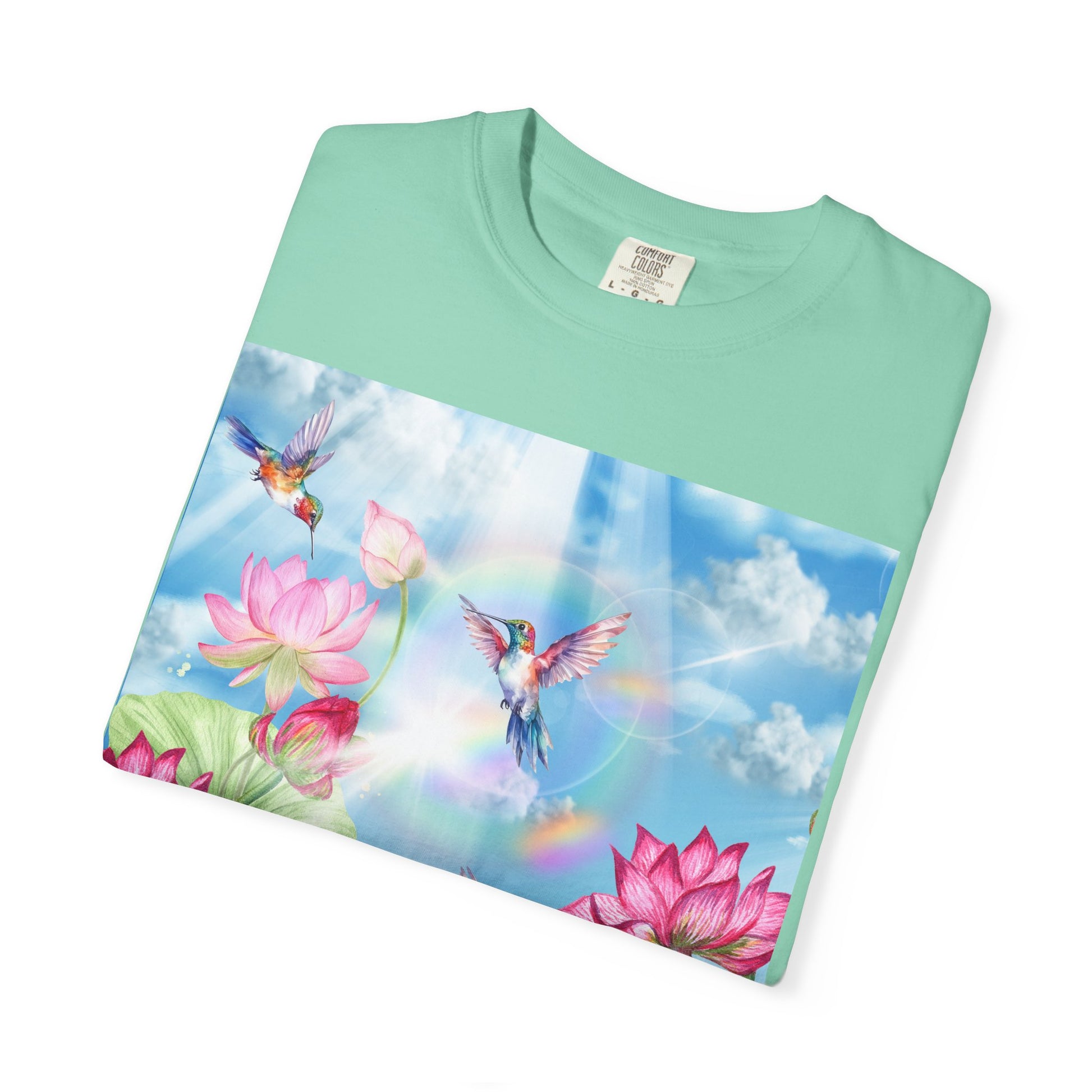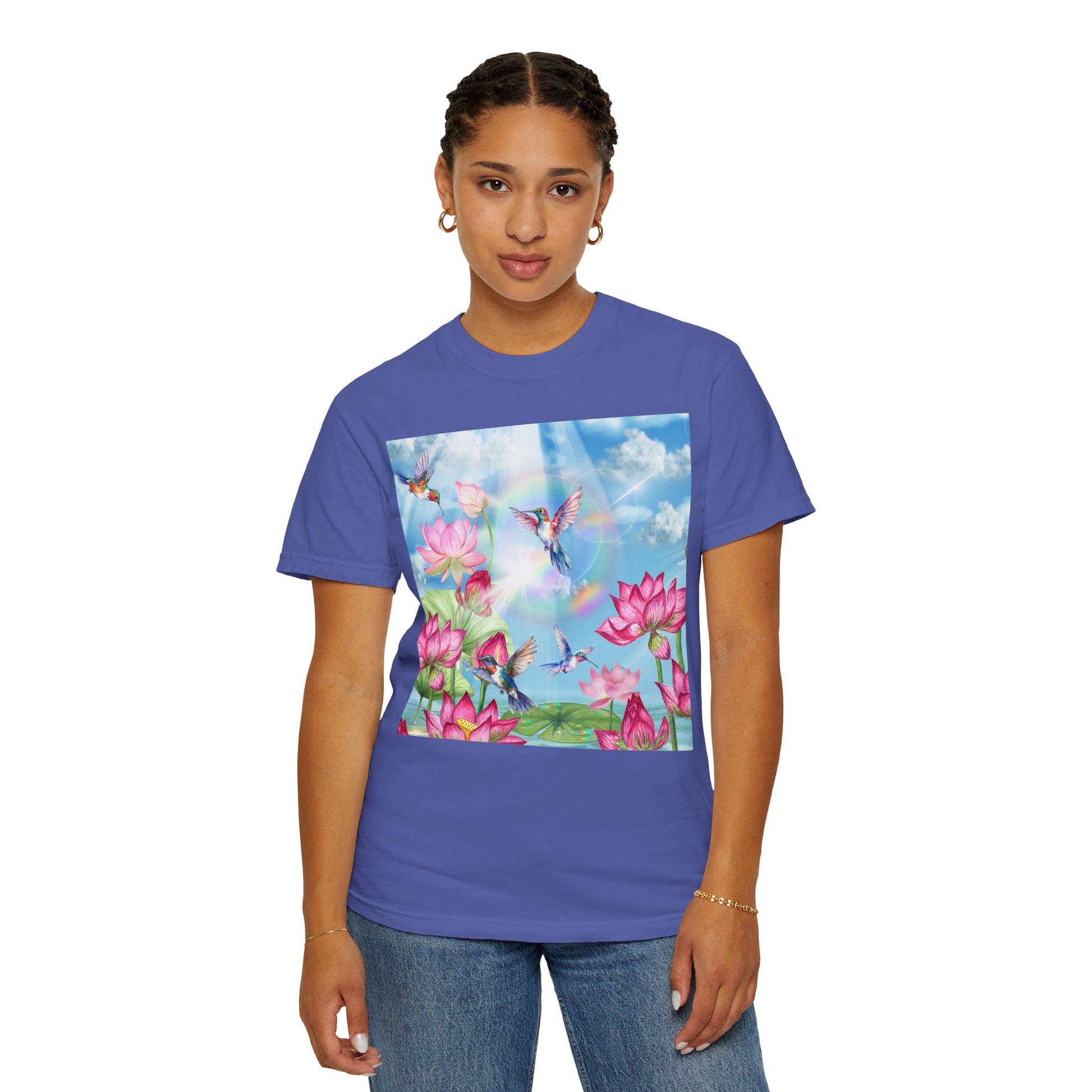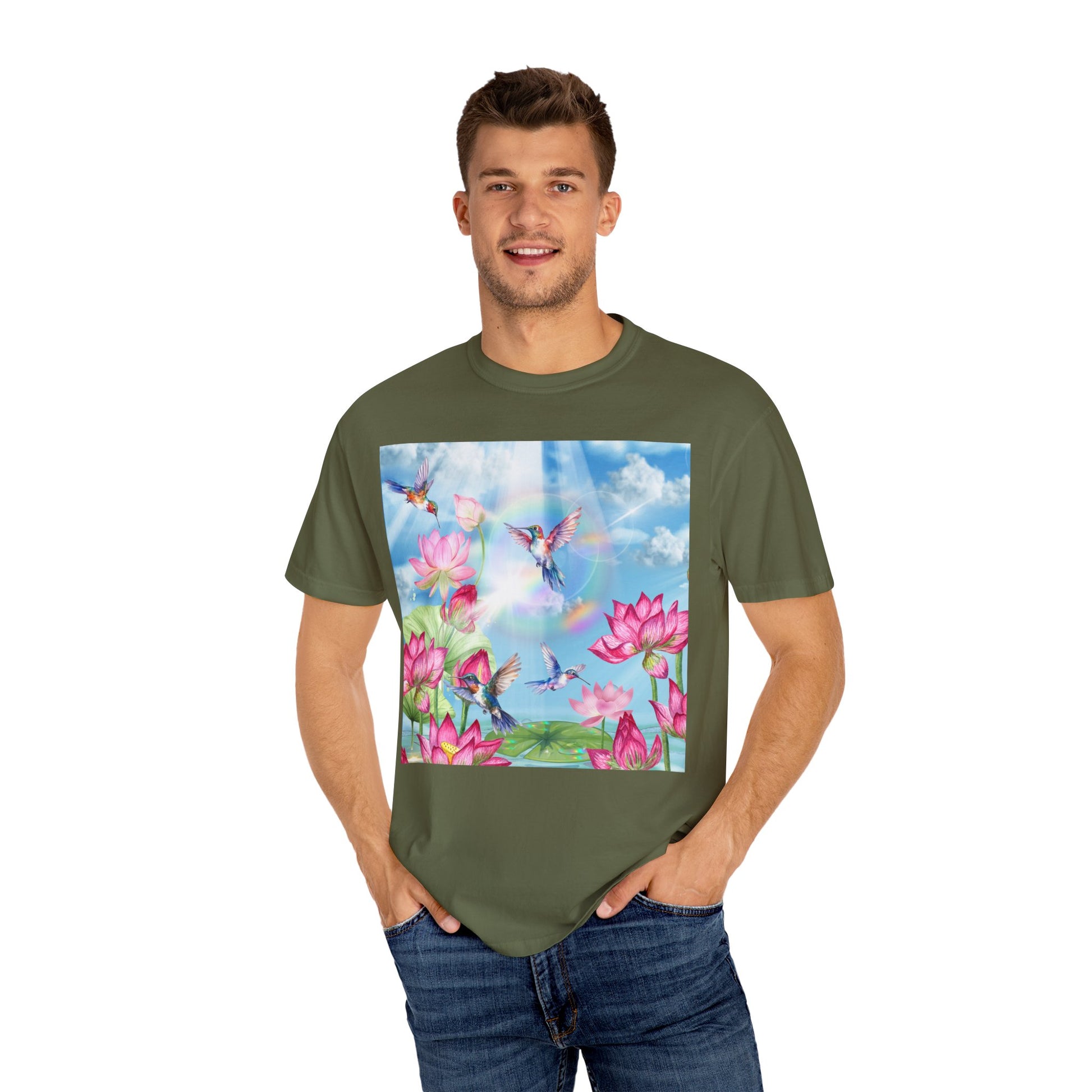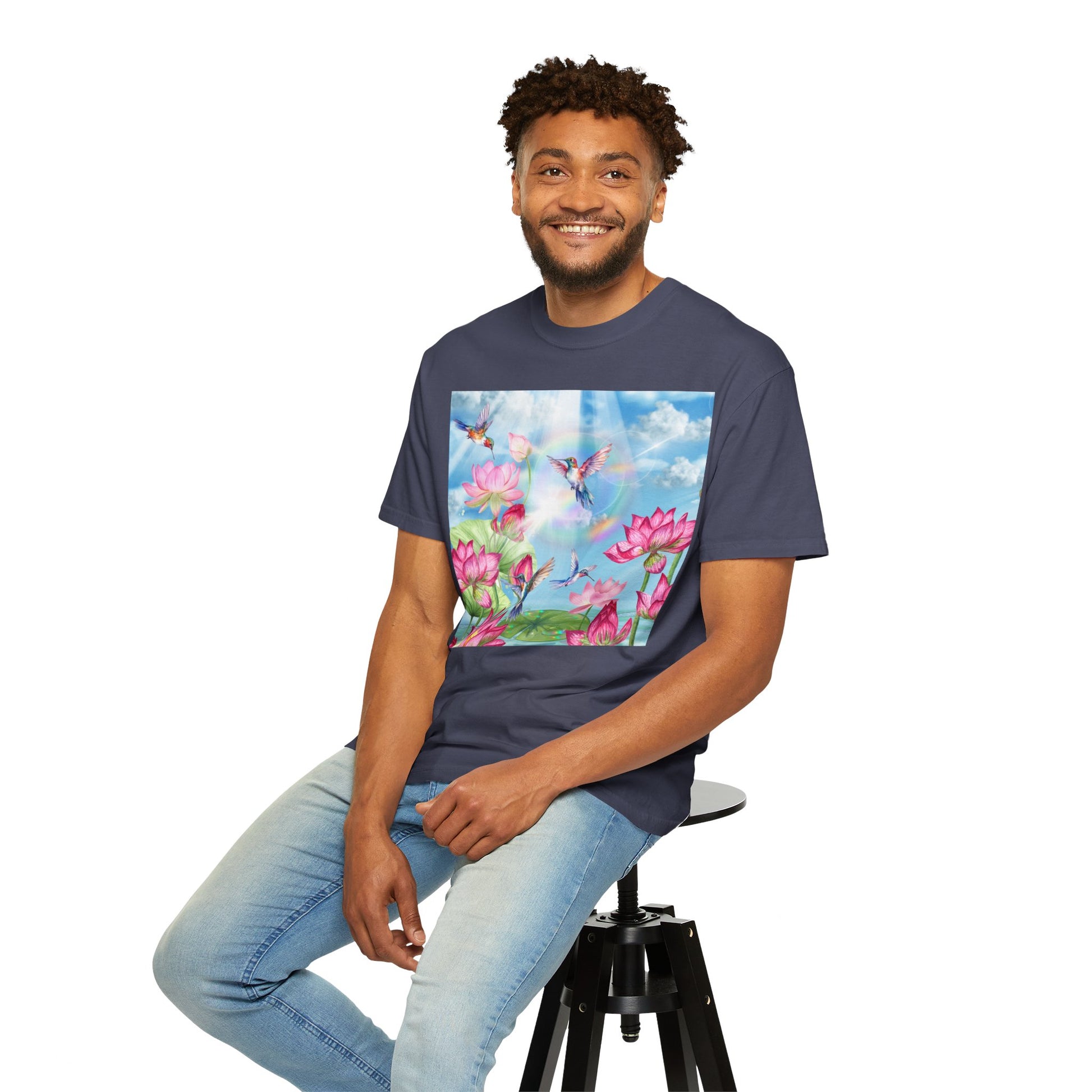 A comfortable and versatile garment-dyed T-shirt featuring a design of hummingbirds sipping nectar against a blue sky. This relaxed fit tee is perfect for nature lovers and those who appreciate serene and peaceful vibes. Ideal for casual wear or as a gift for bird enthusiasts, this T-shirt is relevant for outdoor events, birdwatching outings, and nature-themed occasions.