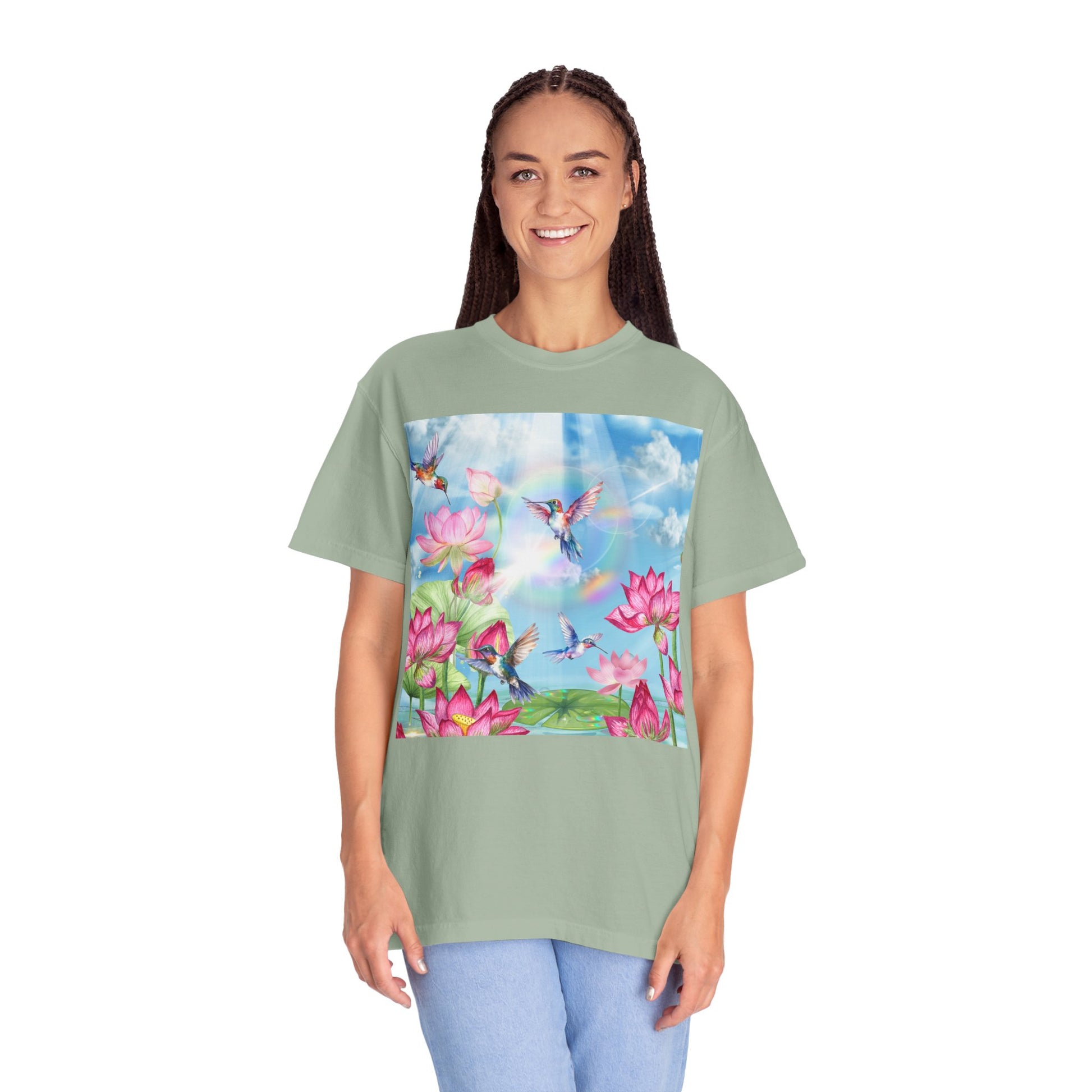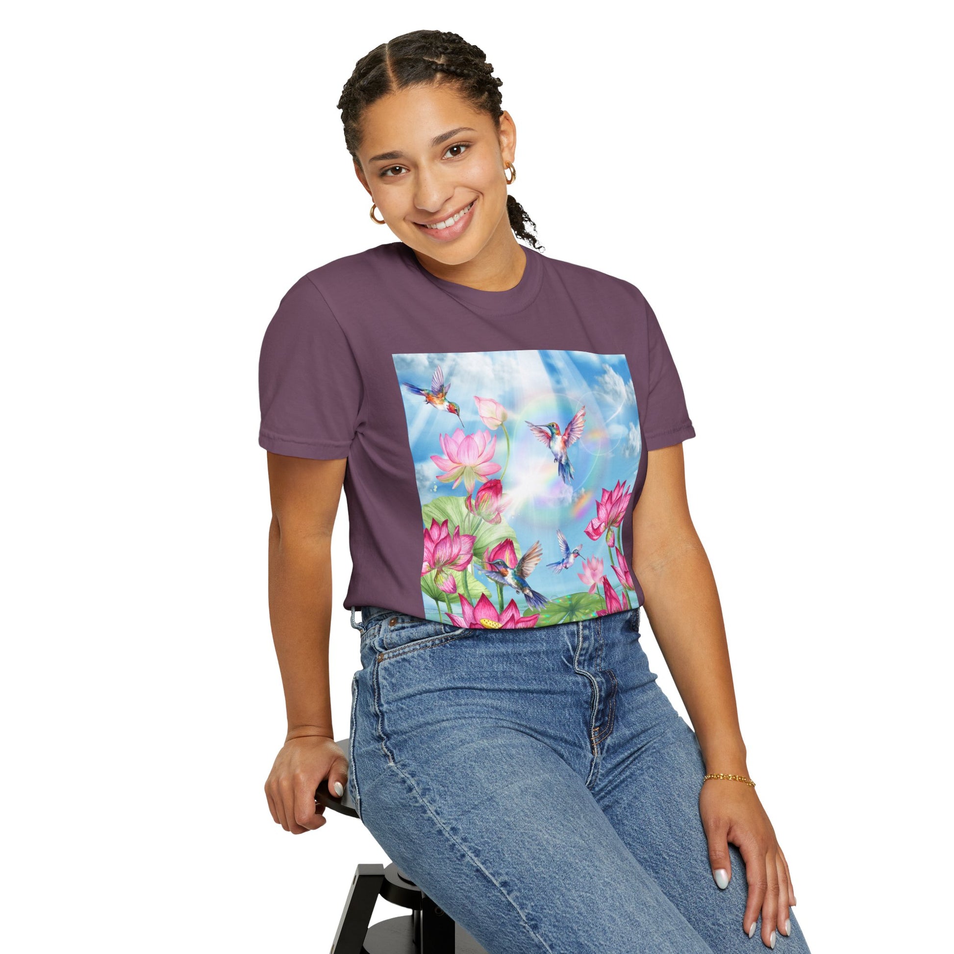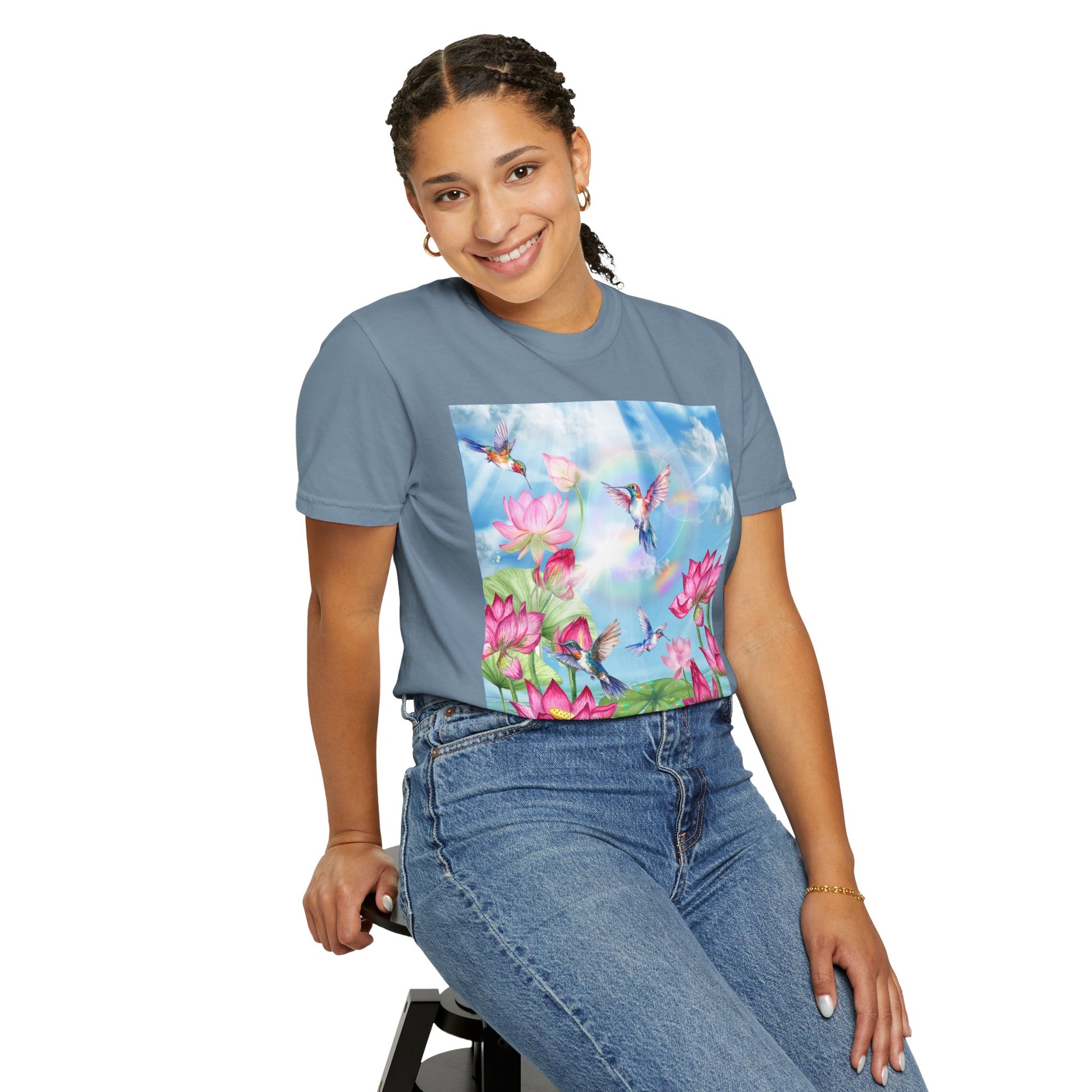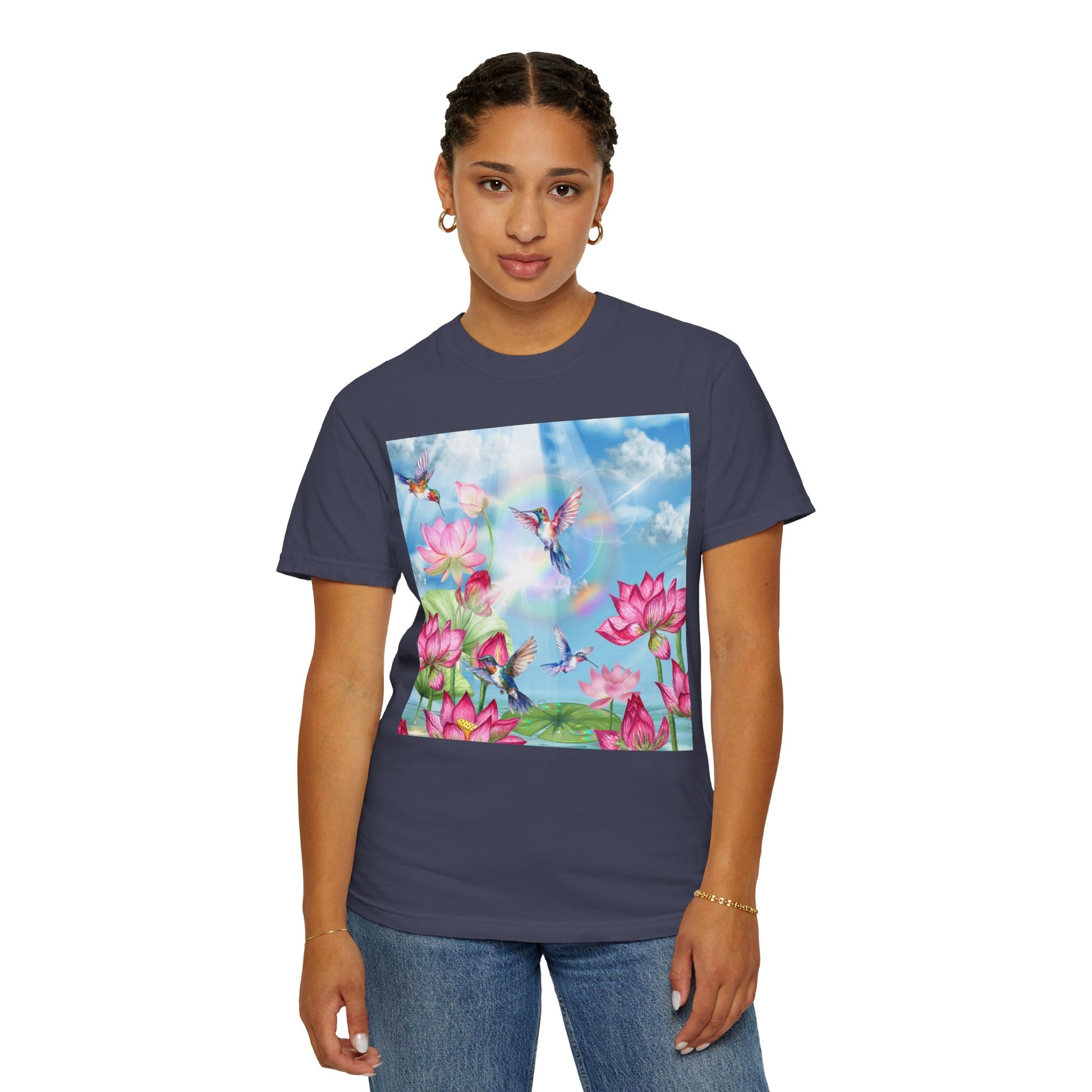 A comfortable and versatile garment-dyed T-shirt featuring a design of hummingbirds sipping nectar against a blue sky. This relaxed fit tee is perfect for nature lovers and those who appreciate serene and peaceful vibes. Ideal for casual wear or as a gift for bird enthusiasts, this T-shirt is relevant for outdoor events, birdwatching outings, and nature-themed occasions.