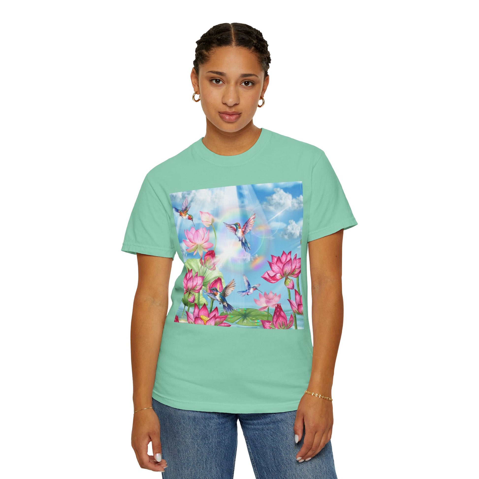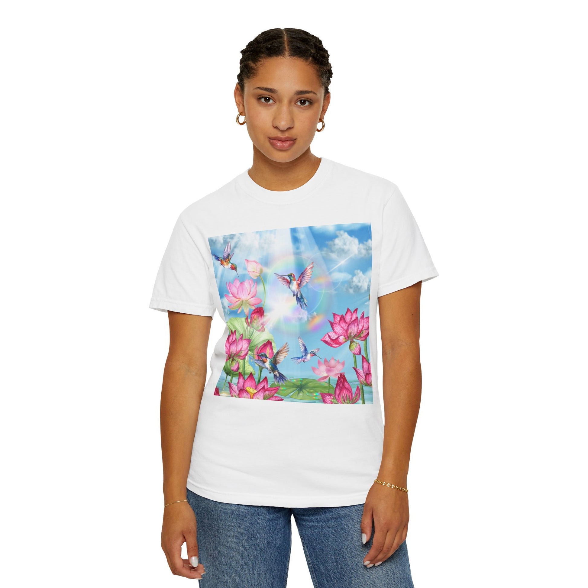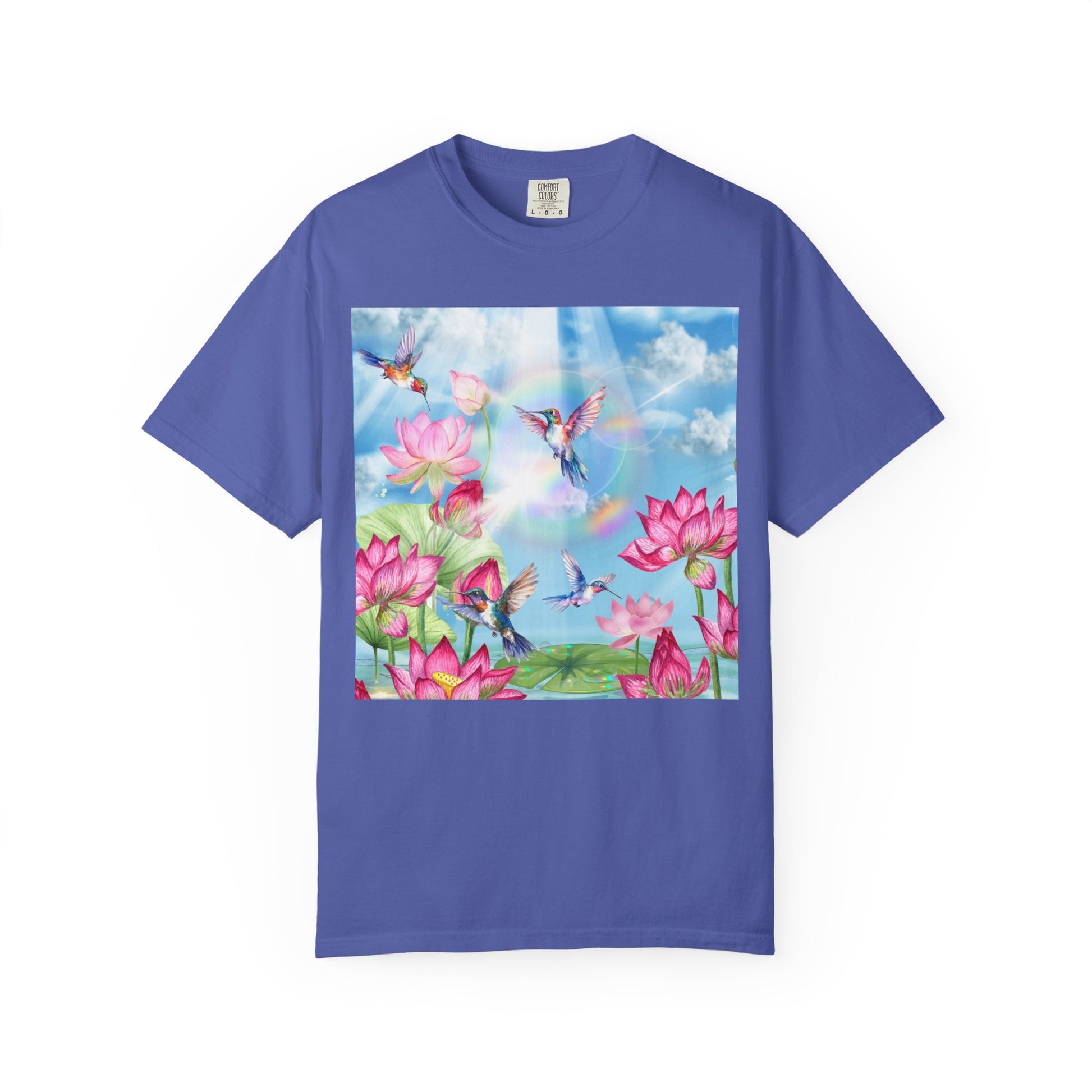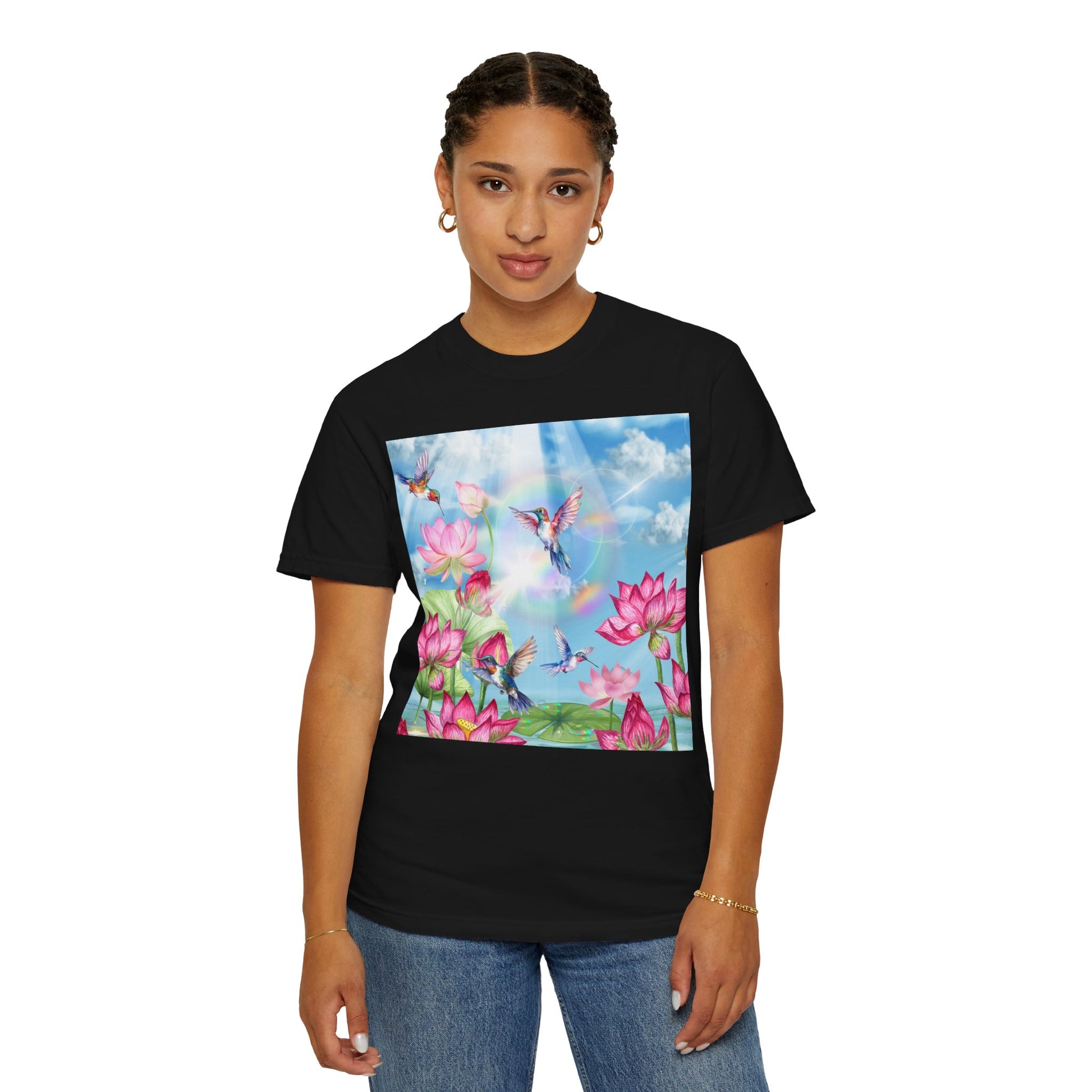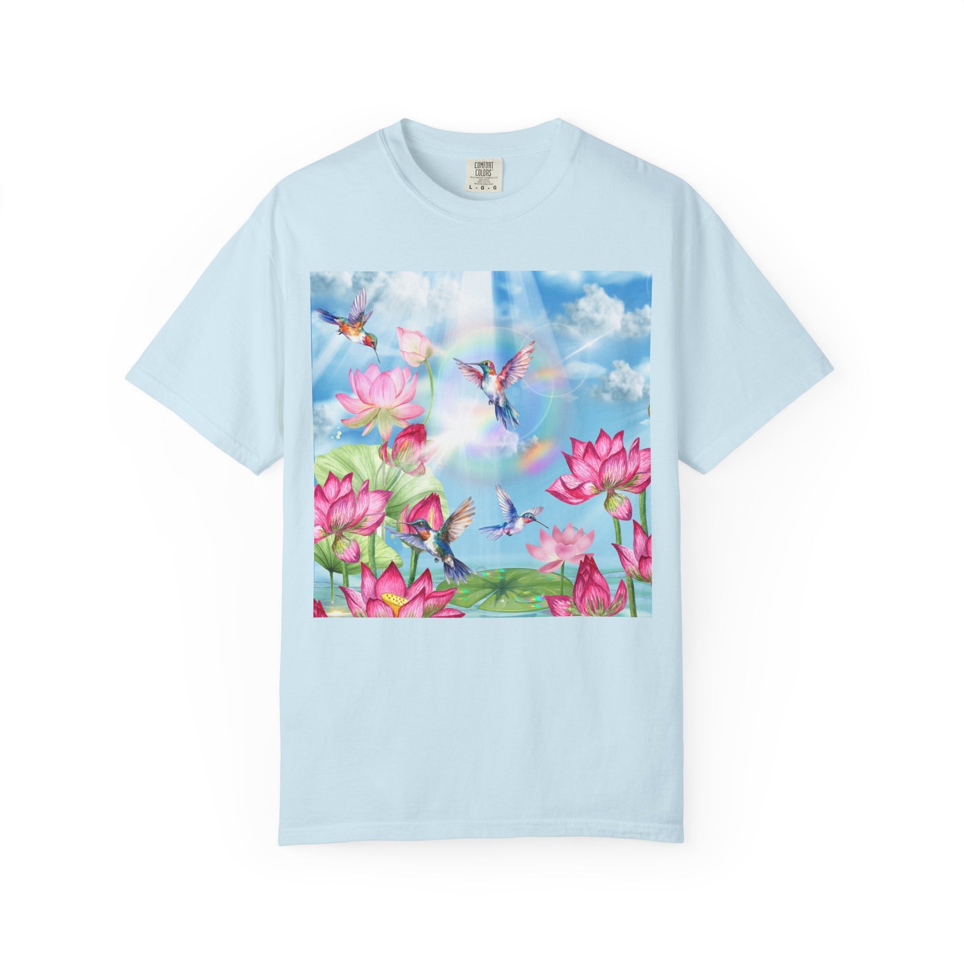 A comfortable and versatile garment-dyed T-shirt featuring a design of hummingbirds sipping nectar against a blue sky. This relaxed fit tee is perfect for nature lovers and those who appreciate serene and peaceful vibes. Ideal for casual wear or as a gift for bird enthusiasts, this T-shirt is relevant for outdoor events, birdwatching outings, and nature-themed occasions.