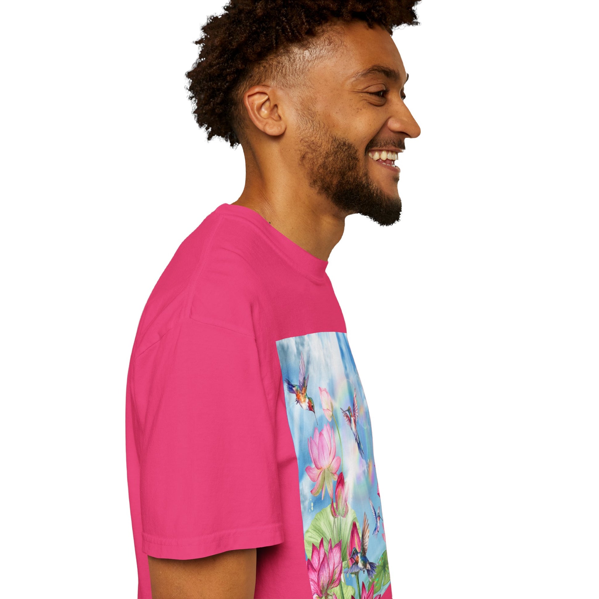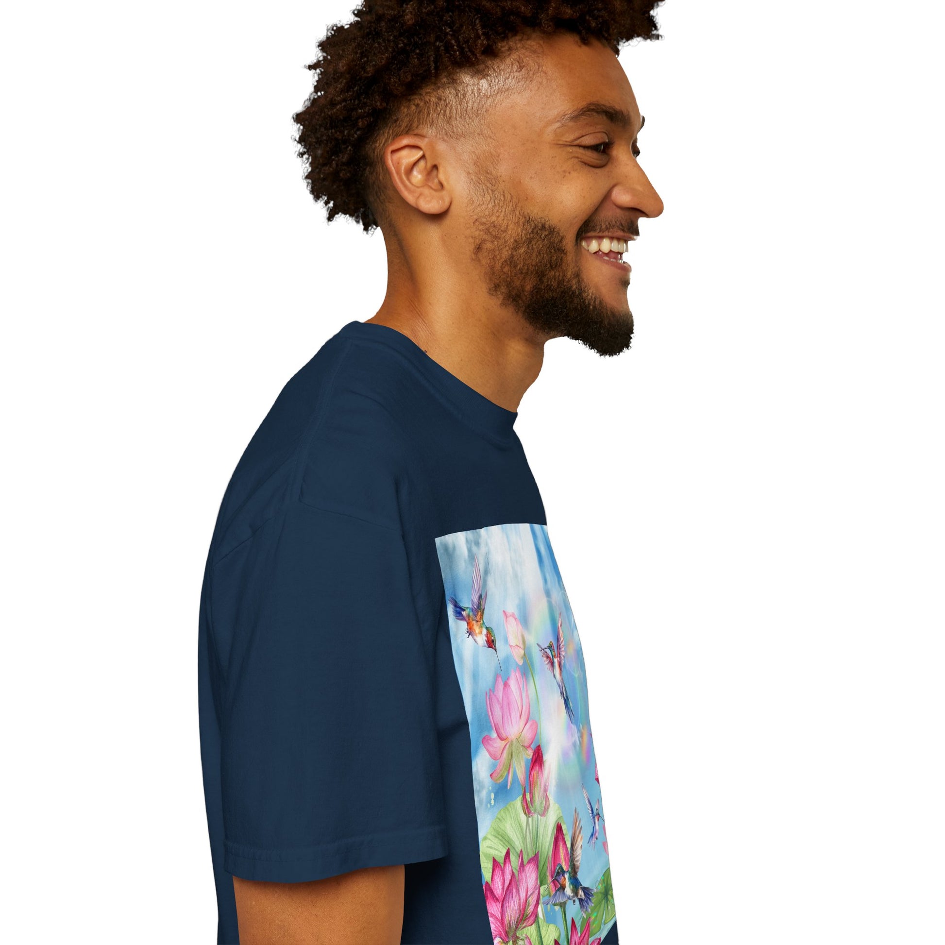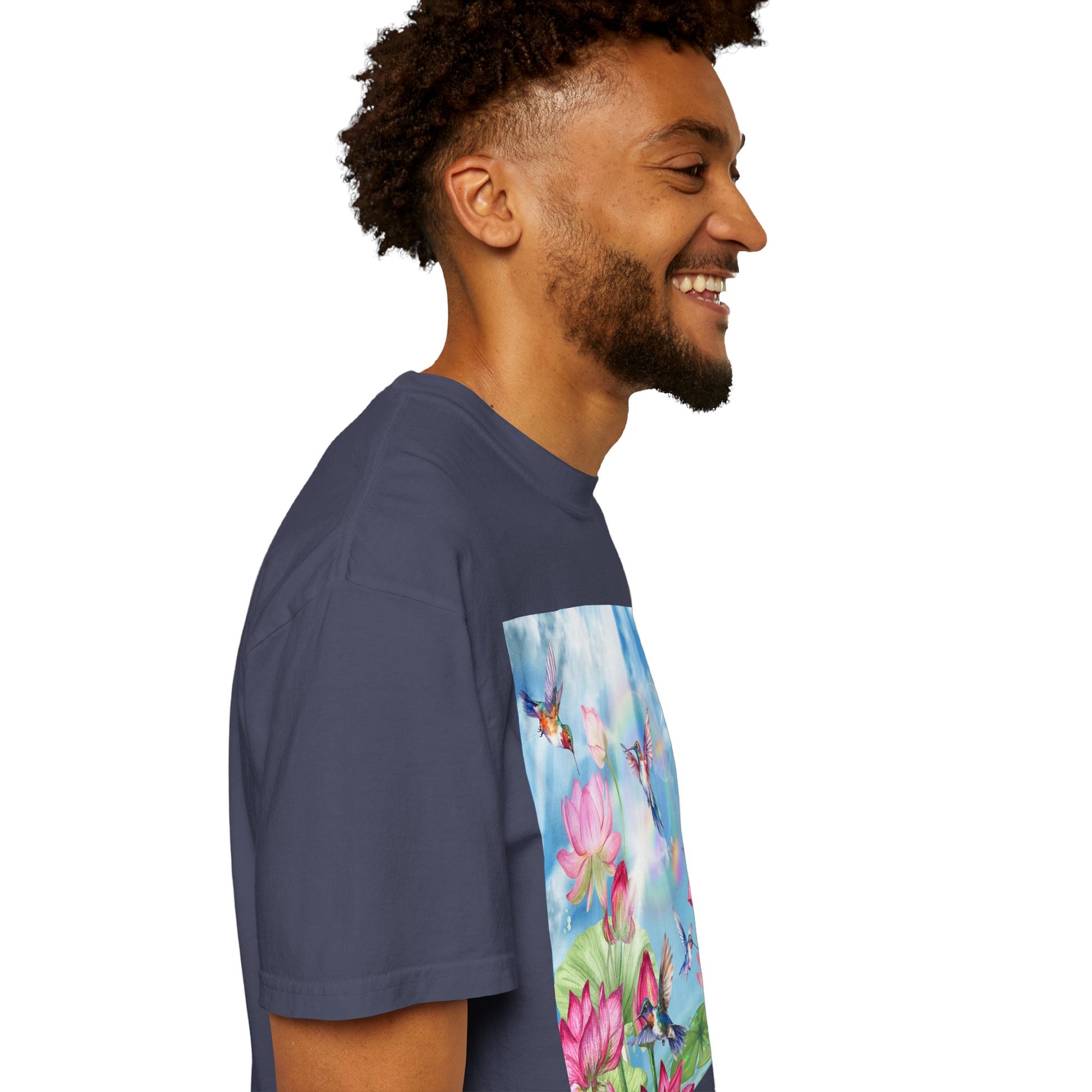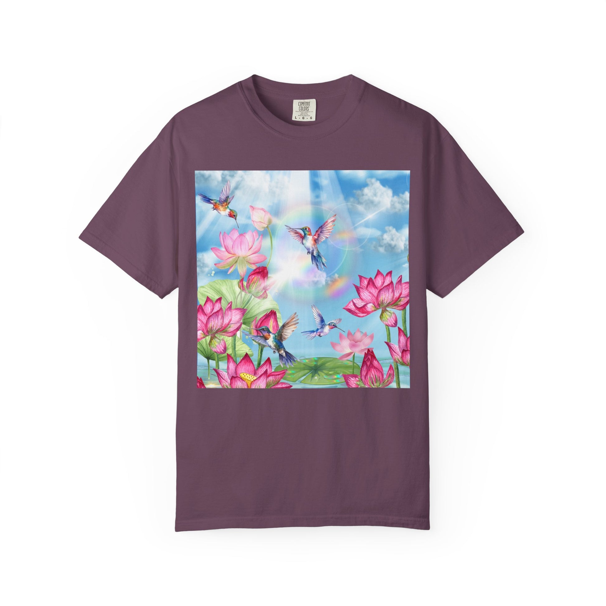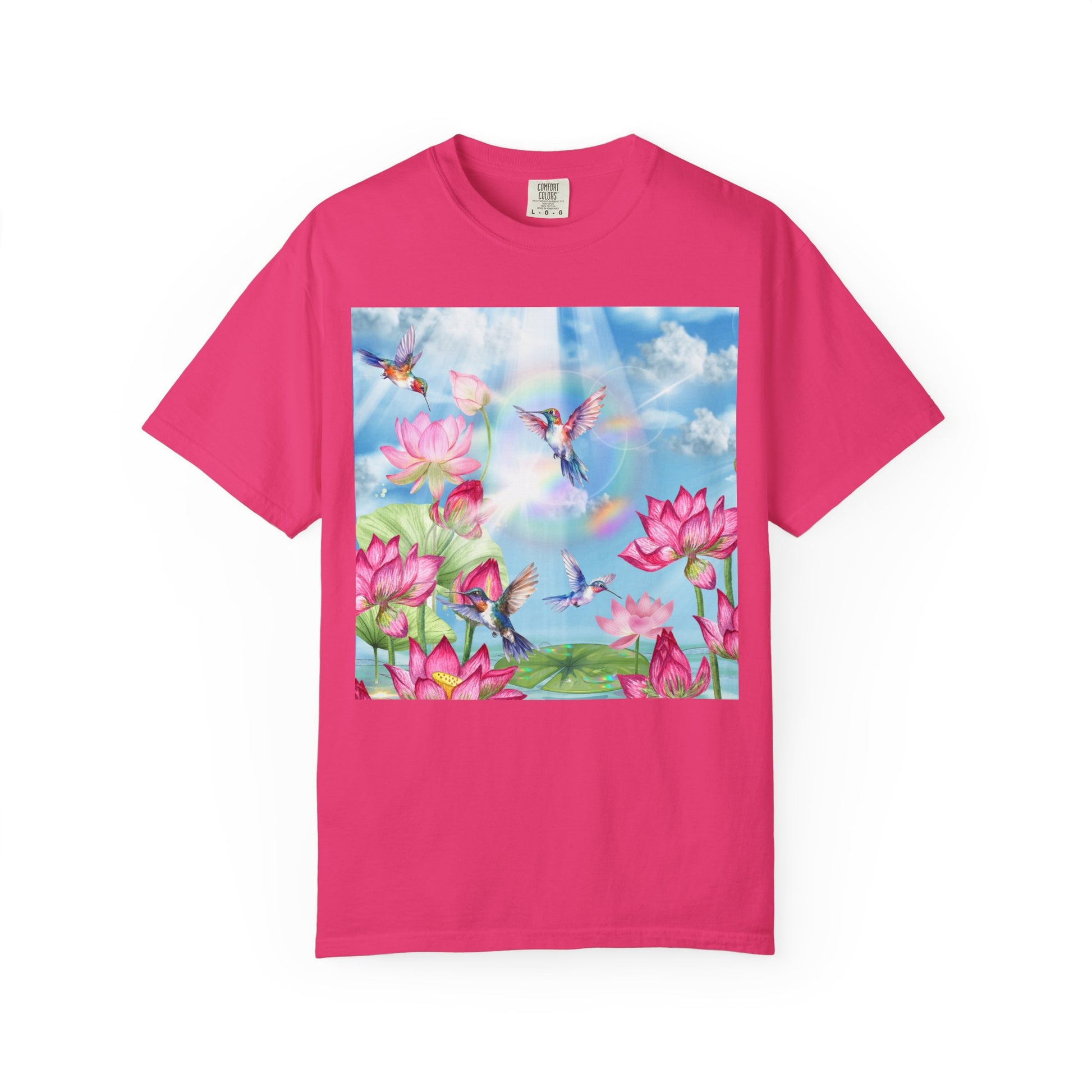 A comfortable and versatile garment-dyed T-shirt featuring a design of hummingbirds sipping nectar against a blue sky. This relaxed fit tee is perfect for nature lovers and those who appreciate serene and peaceful vibes. Ideal for casual wear or as a gift for bird enthusiasts, this T-shirt is relevant for outdoor events, birdwatching outings, and nature-themed occasions.