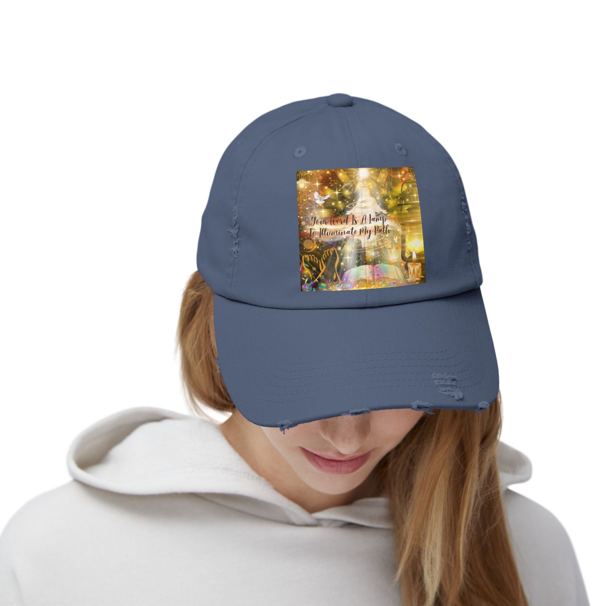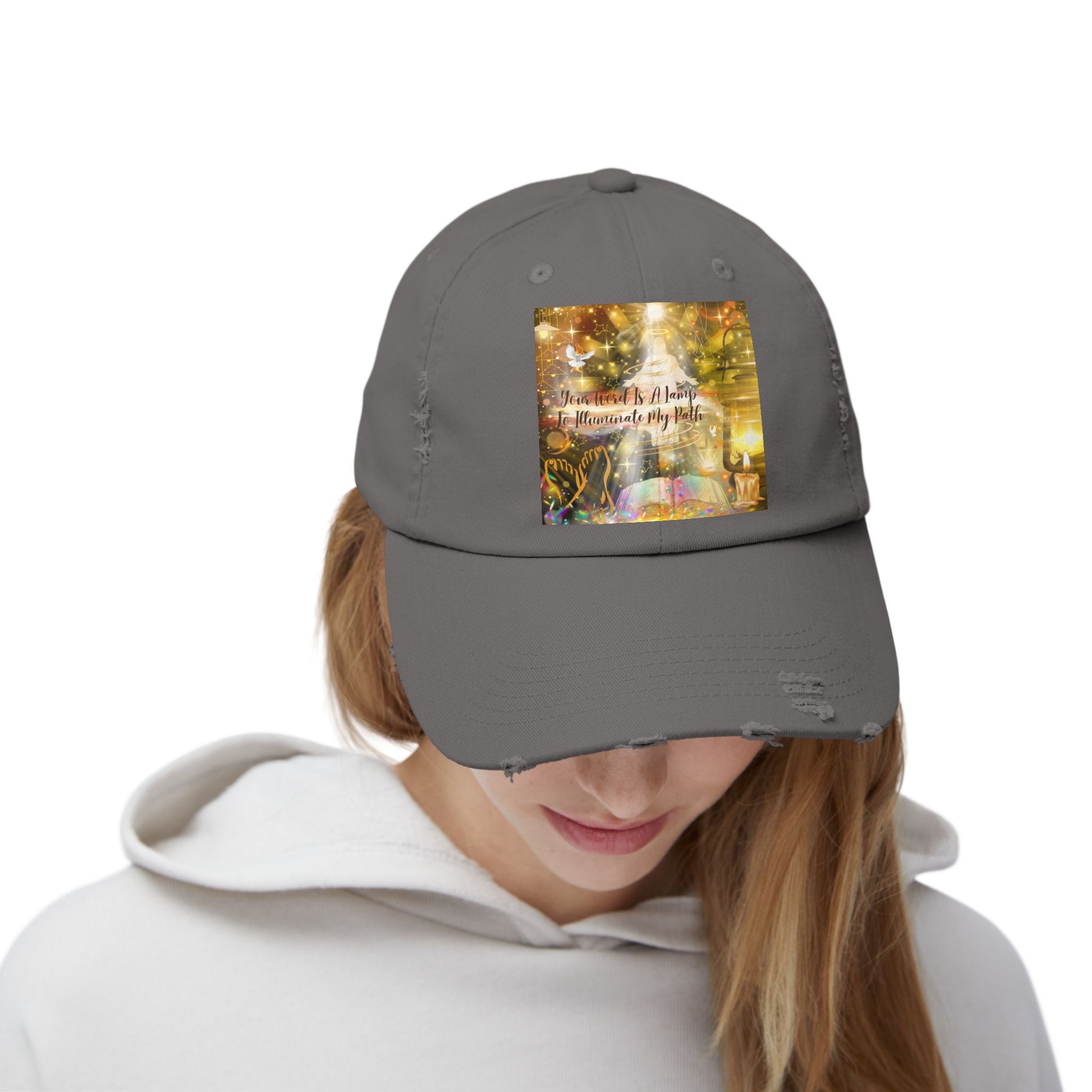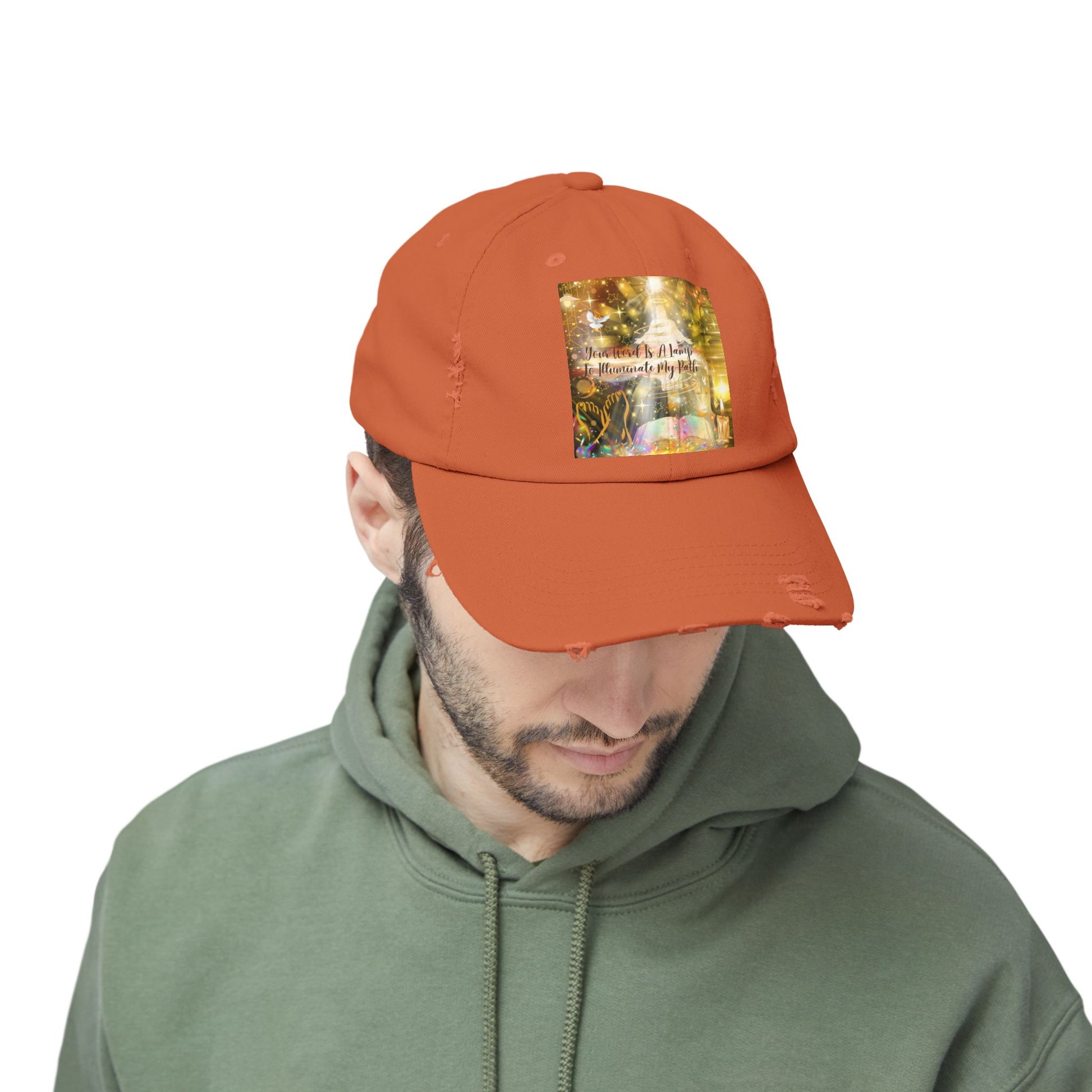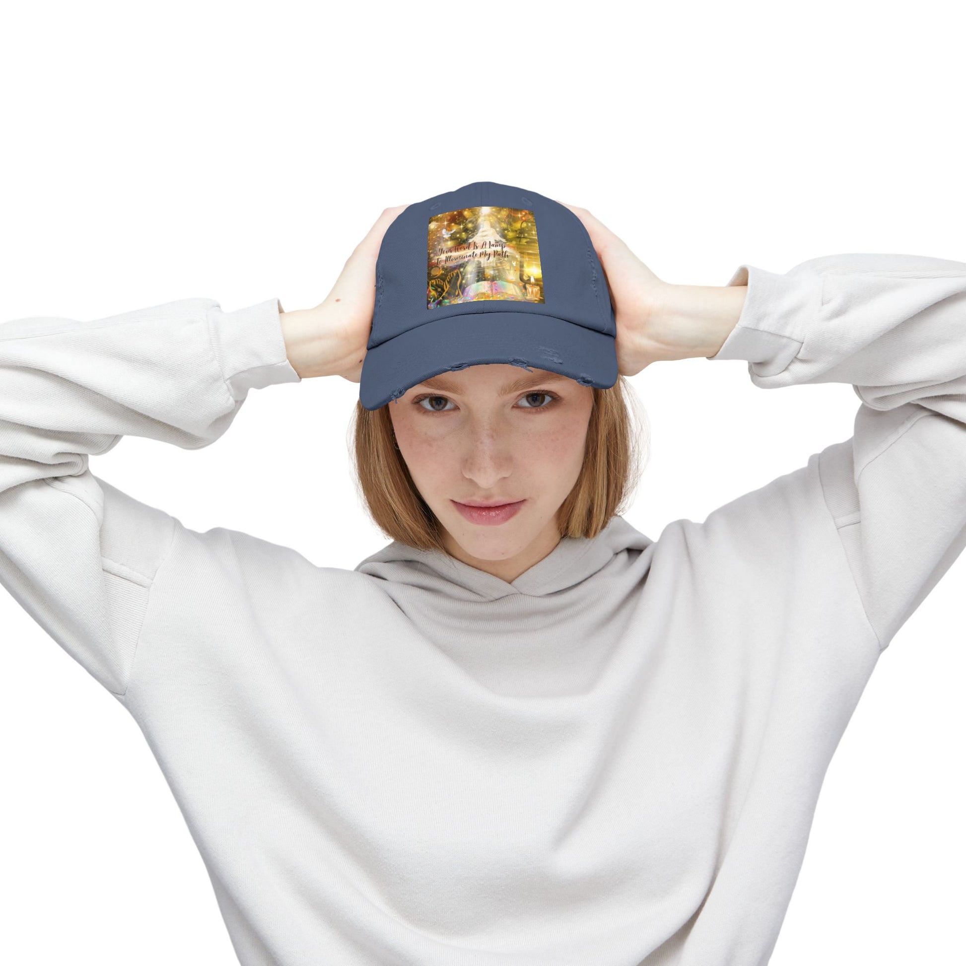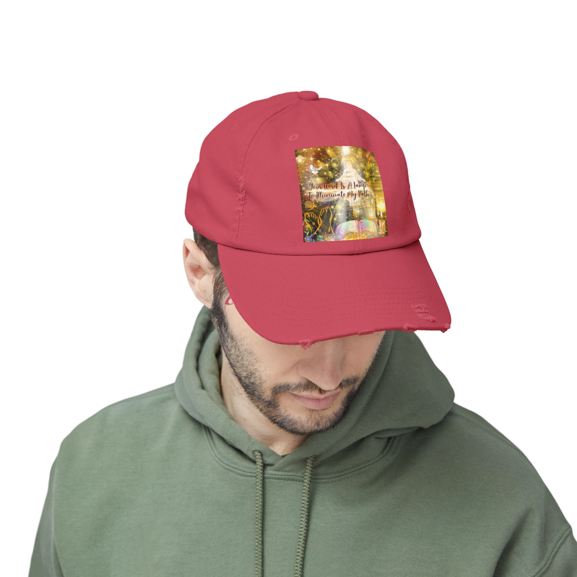This distressed cap gives a vintage and spiritual vibe. Perfect for everyday wear or as a statement piece during religious events or gatherings. Relevant for Christian believers or those looking for a unique accessory.